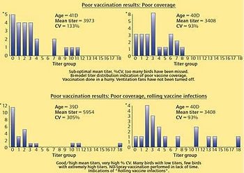 El nivel de los títulos de anticuerpos al día de edad de las aves es muy importante puesto que es la imagen real de los títulos de anticuerpos maternales transmitidos a la progenie (Inmunidad pasiva), éstos pueden variar mucho entre las empresas dependiendo del programa de vacunación de las reproductoras, técnicas de administración de la vacuna, etc. Un ejemplo de la importancia clave del examen de los títulos en aves de un día de edad lo vemos en la repentina aparición de reacciones respiratorias vacunales observadas en pollos de engorde.