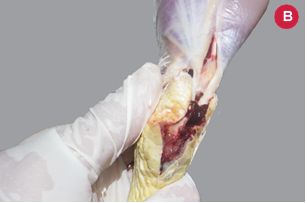 en la situación del reovirus de la parvada. Inicialmente, el área que rodea el tendón roto — generalmente se observa en el tendón gastrocnemio, por encima del tarso— cambia de color, se vuelve de color rojizo – púrpura por la hemorragia, y luego, pasa a verde (figura 3).