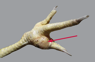 son comunes en los pollos adultos (figura 4). La inflamación grave del cojinete plantar y las falanges causa la cojera subsiguiente.