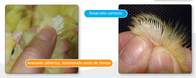 Un buen desarrollo de plumas es sinónimo de buen desarrollo del pollito durante la incubación (¡los pollitos deben verse esponjosos!). No obstante, un desarrollo excesivo de las plumas de las alas indica eclosión temprana (sobrecalentamiento) y tiempo excesivo en las cestas de incubación.