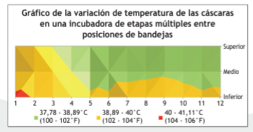 Esto destacará la uniformidad de la temperatura en el interior de la incubadora y ubicará los lugares calientes o fríos adversos, como se puede observar en el siguiente gráfico. Los huevos no fértiles no se deben medir, ya que tiene temperaturas de cáscaras menores que los huevos fértiles por 0,5 -1,7°C (2 – 3°F).