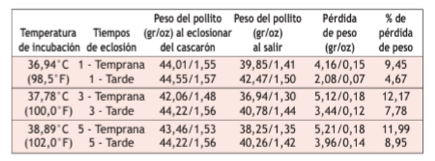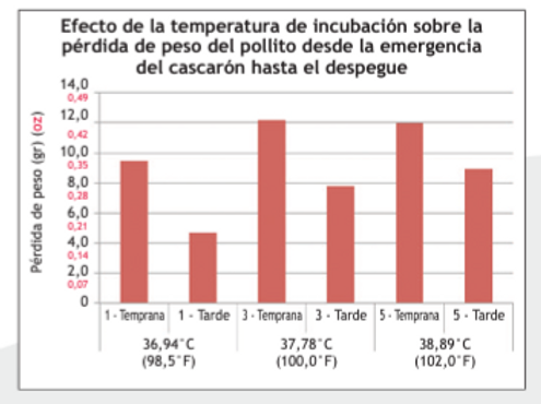 El peso de los pollitos es el criterio más importante de esta lista, ya que las temperaturas altas en los embriones causan eclosiones antes de tiempo, más riesgo de deshidratación y por lo tanto una correlación a mayor mortalidad temprana de los pollos de engorde.