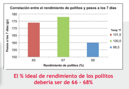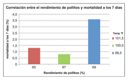 Los ensayos de investigación han demostrado que el porcentaje de rendimiento de los pollitos puede relacionarse con la mortalidad a 7 días de los pollos de engorde y sus pesos corporales, especialmente en los ambientes libres de antibióticos. El exceso de humedad/acumulación de líquidos puede ser más susceptible a las infecciones bacterianas, especialmente con algún factor estresante para los pollitos de un día de edad.
