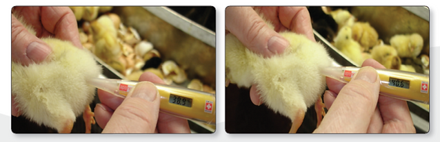 Se puede medir la temperatura rectal interna de los pollitos en el despegue o en la sala de retención de pollitos, pero únicamente una vez que están secos y su temperatura interna se ha estabilizado, o sea, no directamente después de la vacunación en aerosol. La temperatura interna de los pollitos por encima de 41 °C (105,8 °F) causa jadeos.