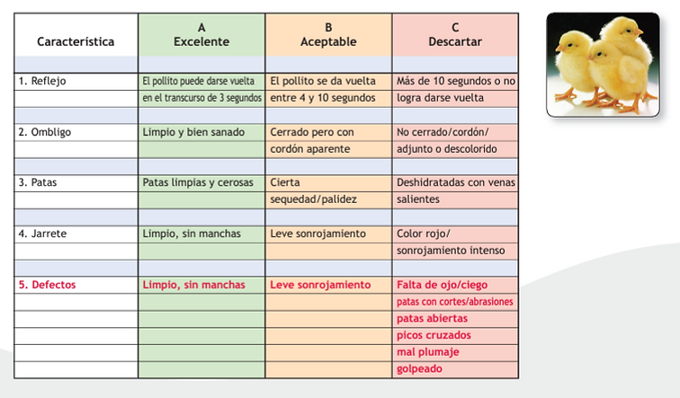 Se debe evaluar la calidad de los pollitos en el inicio en cuanto a los siguientes parámetros y calificar como «A», «B» o «C».