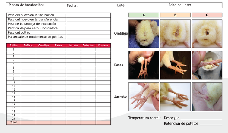 Para lograr una puntuación de «A» deben cumplirse todos los criterios de esta categoría. Un pollito «B» tiene únicamente calificaciones A y B. Cualquier calificación de C = descartar pollito Los puntajes deberán calcularse antes de la calificación y % basados en pollitos A y B.