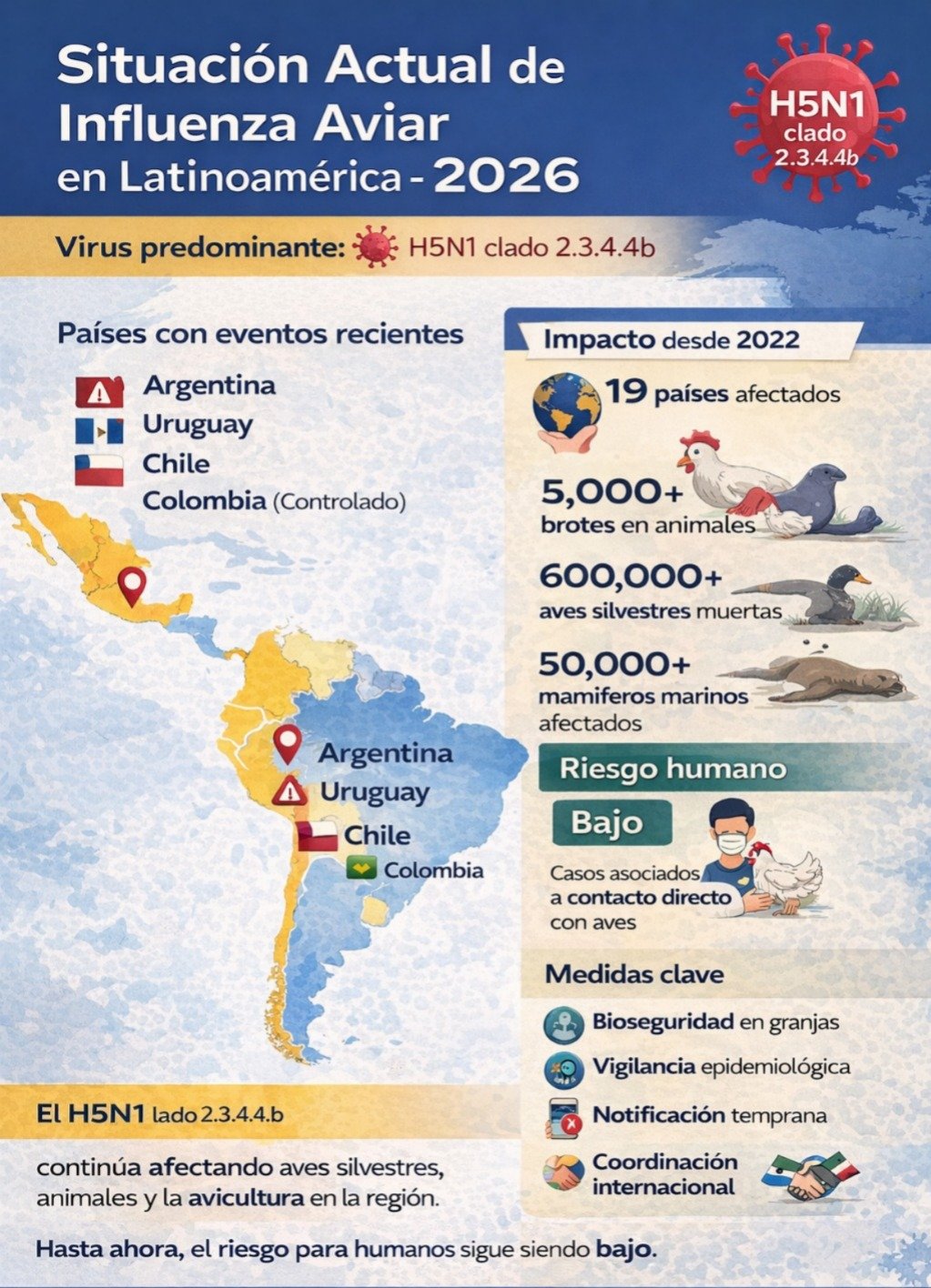 Aunque el impacto principal se ha observado en la producción avícola y en la fauna silvestre, hasta el momento no se han reportado casos humanos en Latinoamérica durante 2026, y el riesgo para la población general sigue siendo considerado bajo.