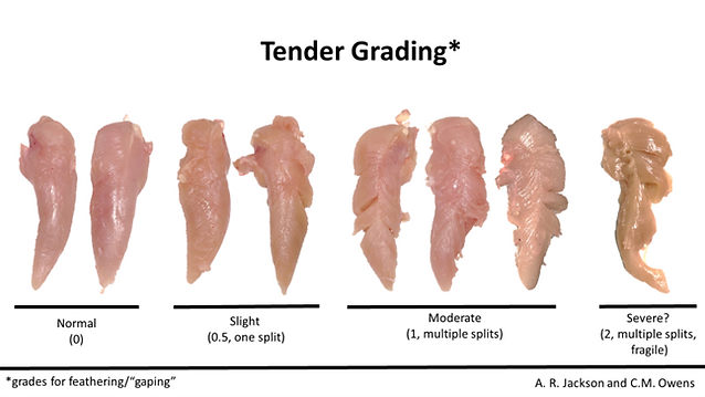 Barbut (2019) mencionó que la progresión es importante para las industrias, pues los filetes con bajos grados de estriaciones blancas o pechuga de madera no ofrecen problemas en el procesamiento y en la comercialización de la carne. Actualmente, un número de procesadores categoriza la carne en las plantas y encamina los casos graves para operaciones específicas. Cobb-Vantress está usando el sistema de clasificación (abajo) al evaluar la calidad del filete (pectoralis minor).