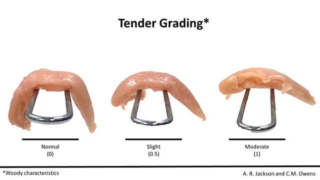 Un filete normal queda blando cuando lo sujetamos por el borde, mientras que la pechuga de madera es dura. El nivel de rigidez puede ser evaluado basándose en la evaluación táctil (en la foto, los filetes están posicionados en el borde de una mesa de acero para demostrar la rigidez). Los filetes están categorizados como 0 (totalmente flexible), 1 (rígido en la región craniana, pero flexible en las otras partes), 2 (rígido en toda la región craniana), 3 (extremadamente rígido en la región craniana y en el borde). Este sistema de evaluación incluye incrementos (0,5) que pueden ser usados si hay necesidad.