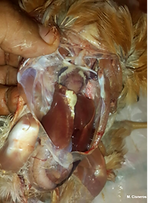 A la necropsia se puede evidenciar exudado grisáceo y espeso en articulaciones, hepatomegalia, esplenomegalia, riñones moteados e hinchados, aerosaculitis en la cavidad torácica y abdominal.