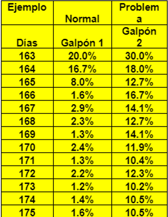 En la tabla al lado queda bien claro que en cuestión de 4 días él % de huevos de piso baja substancialmente en un lote normal .La misma situación pero ahora a base semanal del inicio al pico de producción. Básicamente en 4 semanas, en una situación normal, se baja de 9% para menos de 1% los huevos de piso. El lote problemático baja de 17% para 4-5% en pico de producción. En el último caso se debe buscar las razones por la cual las hembras no quieren entrar o no han encontrado el nido como el mejor sitio para poner su huevo.