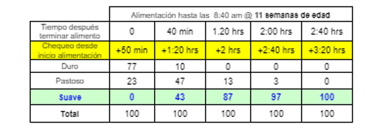 Como se puede observar, 2 horas y 40 minutos después de iniciar la alimentación 97% de las hembras tienen un buche suave.