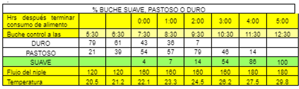 Como se observa en el ejemplo con 30 semanas de edad incluso con 160 cc de flujo de agua/minuto las hembras todavía necesitan alrededor de 5 horas, después de terminar el alimento, para tener 100% de los buches suaves.
